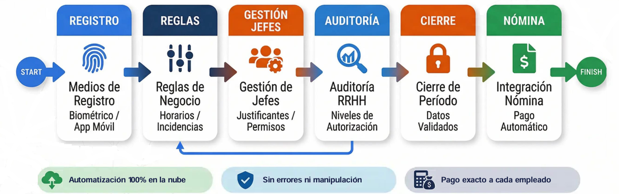 Nuestro principal requerimiento era consolidar en una sola plataforma todas las Unidades de Negocio y, a través de equipos biométricos, administrar los registros de entradas y salidas del personal, detectando de manera sencilla retardos, faltas, salidas anticipadas, tiempos extras, prima dominical, entre otras incidencias.